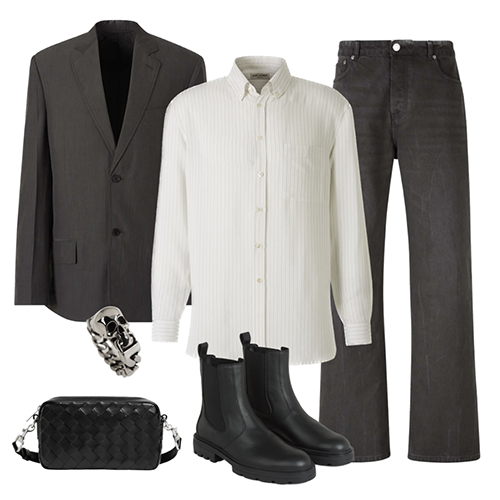 Durante las próximas semanas se celebrarán múltiples fiestas tipo cóctel, un evento que permite mayor libertad para experimentar y arriesgar con prendas, colores y estilos. Con el minimalismo de los años 90 como punto de partida, combinamos una camisa de rayas de Saint Laurent con un blazer oversize de Balenciaga en gris marengo, un tono similar al de los pantalones anchos de Ami Paris. Seguimos apostando por los tonos oscuros para los complementos, como un bolso cruzado de Bottega Veneta, botines tipo chelsea de Hogan y anillo con calavera de McQueen.