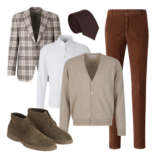 El estilo dandy, asociado al uso de sastrería clásica, los sombreros, estampados elegantes y corbatas, se ha convertido en una de las tendencias más destacadas de las últimas temporadas. Mediante piezas formales con toques modernos para el día a día, construimos este look combinando una americana de cuadros firmada por Canali y superpuesta a un conjunto de camisa y cárdigan, ambos de Santa Eulalia. Para completar el estilismo, seguimos con la gama cromática del blazer y añadimos pantalones de pana de Marco Pescarolo, corbata burdeos de Santa Eulalia y calzado de ante de la colección de Tod’s.
