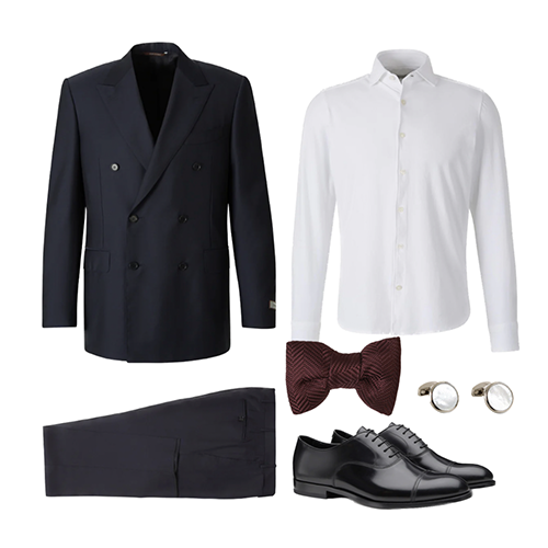 Terminamos con aquellos eventos más formales y de gala que requieren de estilismos formales donde la sastrería juega un papel fundamental en el vestuario masculino. Siguiendo las tendencias de las últimas temporadas, puedes elegir un modelo cruzado de doble botonadura que firma Canali y combinarlo con una camisa blanca clásica de Santa Eulalia y zapatos negros con cordón de Doucal’s. Para este tipo de estilismos, las pajaritas, corbatas y los gemelos se convierten en los complementos por excelencia. Entre la amplia variedad de propuestas, seleccionamos una pajarita burdeos de Tom Ford y unos gemelos con detalles de nácar de Tateossian.