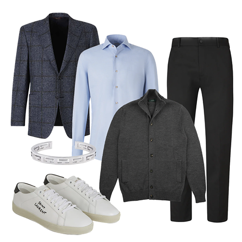 De la moda más sofisticada para el día pasamos al concepto de smart casual para aquellas celebraciones donde se requieren looks elegantes, pero sin ser demasiado formales. En este caso volvemos a repetir la combinación de americana con camisa y cárdigan, esta vez con un blazer de cuadros en azul de Canali, jersey en gris de Zanone, camisa azul de Santa Eulalia y pantalones de PT Torino. Para los complementos, puedes romper con el efecto monocromático del look con unas deportivas blancas y minimalistas, como el modelo con logotipo de Saint Laurent, y añadir un toque personal con una pulsera de Givenchy.