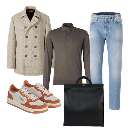 Los pantalones vaqueros son una de las prendas más versátiles que se pueden adaptar tanto a los estilismos más informales como a conjuntos elegantes. Para una propuesta casual y sofisticada combinamos unos jeans rectos de Acne Studios con un polo de punto de Santa Eulalia y un abrigo con espiga y doble botonadura de Brunello Cucinelli. Para los complementos nos decantamos por una bolsa tipo maletín de Valentino en negro y aportamos un punto de contraste con unas deportivas de color naranja y blanco de Autry.