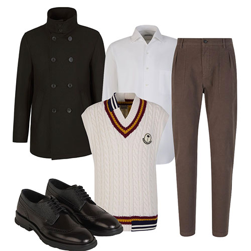 Seguimos con un estilismo que reúne la prenda clave del concepto preppy. Hablamos de los diseños con cuello de pico, bandas de colores, tejido en ochos y logotipos a modo de escudo que aluden al uniforme del colegio. En la nueva colección de Moncler encontrarás una propuesta de chaleco preppy que puedes mezclar con abrigo de doble botonadura de Herno, camisa blanca de Loro Piana, pantalón claro de Sease y unos elegantes zapatos en cuero de Alexander McQueen.