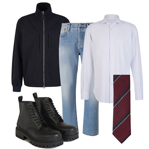 Al mismo tiempo que surgió el estilo preppy los vaqueros empezaron a ganar popularidad gracias al cine y se incorporó como un básico del vestuario masculino. Para jugar con unos jeans claros de corte recto, como los que firma Acne Studios, decántate por una camisa blanca de Vincenzo di Ruggiero y una sudadera con cremallera de Stone Island que aportará un toque moderno y deportivo. Para complementar el estilismo añade unas botas estilo militar de Balenciaga y refuerza el toque preppy con una corbata de rayas en rojo y marino.