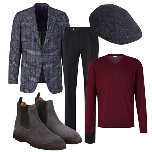 Americana de Isaia, jersey de Santa Eulalia, pantalón de Santa Eulalia, botín de Bontoni y boina de Borsalino