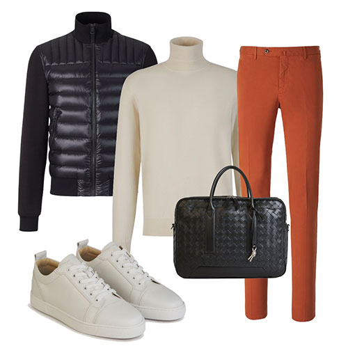 Para construir un look preppy de forma sutil, puedes optar por añadir un punto de contraste a tu look de diario formal con una prenda de color. Optamos por un conjunto protagonizado por unos pantalones anaranjados de PT combinados con jersey crema de Loro Piana, abrigo acolchado de Mackage y unas deportivas blancas de Christian Louboutin. Para los accesorios apostamos por un maletín de Bottega Veneta que conforma un perfecto estilismo preppy para ir a la oficina.