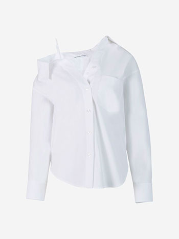 Si quieres arriesgar con un estilismo informal, Alexander Wang presenta un modelo de popelina con escote asimétrico que deja al descubierto un hombro. Completa el estilismo con unos pantalones vaqueros de corte recto o una minifalda y juega con los accesorios para añadir un punto de sofisticación.