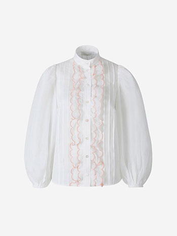 Llegamos a un encuentro de tarde y decidimos añadir un punto romántico al estilismo con un elegante diseño de Zimmermann que incluye volantes con un toque rosado y mangas abullonadas. Esta opción es perfecta para que el color esté presente en tu estilismo con una falda de seda con motivos floral o un pantalón con estampado de formas abstractas que alterne distintos tonos.