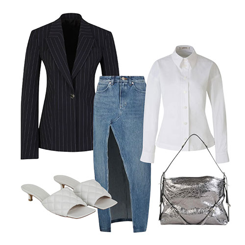 Empezamos con una propuesta elegante que integra algunas de las tendencias más populares de las últimas temporadas, como el minimalismo de los 90 y la fiebre por el denim. Con un blazer de The Attico en marino y estampado de raya diplomática añadimos una camisa clásica de color blanco que firma Dorothee Schumacher y una falda de tubo con apertura frontal de Alexander Wang. En los accesorios, replicamos el blanco con unos mules de Bottega Veneta y añadimos un punto sofisticado con un bolso metalizado de Givenchy.