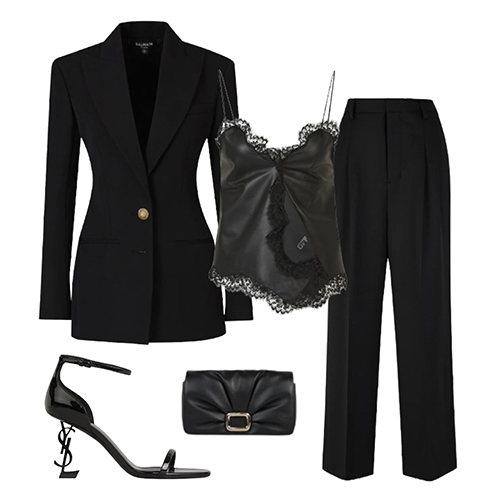 Finalizamos con una propuesta formal y elegante para un estilismo de noche con un total look de color negro. Protagonizado por un blazer entallado con botón dorado de Balmain, combinamos la pieza con un pantalón de pinza clásico de Ami Paris y un top lencero de tirantes y encaje que firma Off White. Para los complementos, nos decantamos por unas sandalias de Saint Laurent con el logo de la firma en el tacón y un clutch de Roger Vivier que incluye cierre metalizado como detalle de contraste.