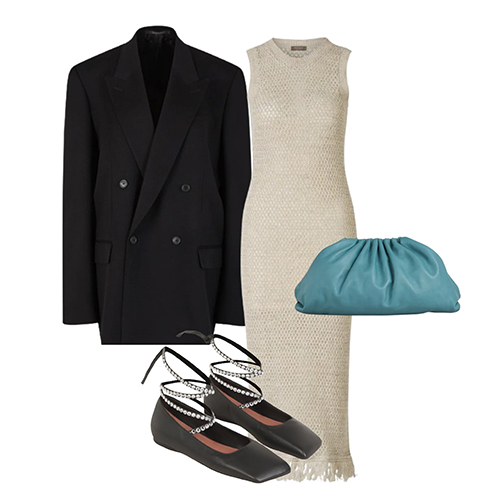 Para la temporada de entretiempo el blazer también puede ser uno de los imprescindibles que puedes incluir en cualquier tipo de estilismo. En este caso optamos por la combinación de un modelo oversize de Balenciaga combinado con vestido. La pieza, diseñada por Peserico incluye una silueta ajustada con tejido efecto red que puedes combinar con zapatos con tira efecto joya de Amina Muaddi y un clutch en azul de Bottega Veneta como punto de contraste para un resultado más formal.