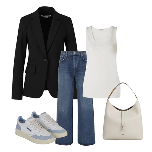 El blazer es una de las piezas más versátiles que puedes elegir tanto para looks formales como para combinarlo con vaqueros y piezas deportivas con el objetivo de conseguir ese resultado más urbano e informal. En esta propuesta te presentamos la fórmula por excelencia para dar un giro al sobrio blazer de color negro con un modelo de Veronica Beard que combinamos con top de tirantes de Moncler, pantalones vaqueros de Agolde y deportivas de Autry. Para completar el estilismo, añadimos un bolso tipo shopper en color blanco que firma Chloé, una propuesta con gran capacidad y funcional para el día a día.