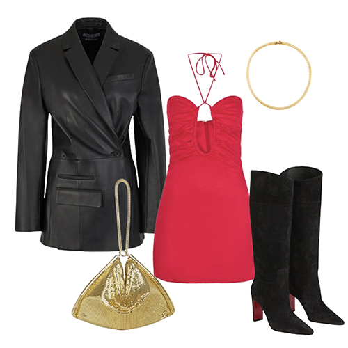 Las fiestas que incluyen la etiqueta ‘coctail’ son el momento perfecto para experimentar con las prendas más arriesgadas y aportar un toque de color y diversión con los tejidos de los estilismos. Empezamos seleccionando un blazer de cuero negro y cruzado de Jacquemus que combinamos con mini vestido en rojo de Cult Gaia y botas negras de Christian Louboutin. Como complemento al tono rojizo predominante añadimos un bolso de mano con la popular maya de Paco Rabanne y un collar minimalista de Zimmermann.