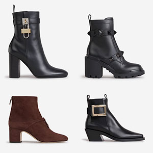 Por último, hablamos del botín con tacón, el clásico atemporal que se renueva cada año. Destacamos la propuesta de ante de Loro Piana y el diseño con detalles dorados de Givenchy. Además esta temporada también encontramos otros modelos que incorporan estilos mencionados anteriormente, como el acabado de tachuelas y estética militar en Valentino o el tacón ancho estilo cowboy en el botín de Roger Vivier.