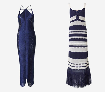 Durante las últimas dos temporadas, la grandes firmas de moda han apostado por los flecos como el recurso por excelencia para conseguir piezas originales y con movimiento. Entre las nuevas propuestas destaca un vestido de punto con detalle de flecos en el bajo de Johanna Ortiz o el ajustado modelo Renata de Cult Gaia en azul marino con efecto metalizado.