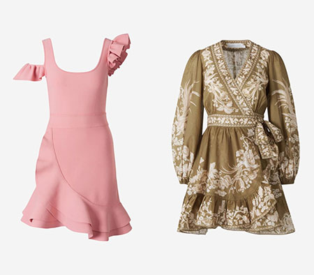 La primera regla para escapar del clásico vestido midi en una boda diurna es el juego con las proporciones y los patrones sofisticados. Si quieres elegir piezas originales, Alexander McQueen presenta un vestido con cortes y volantes desiguales en las mangas y falda asimétrica y Zimmermann se decanta por la silueta cruzada con su diseño de estampado floral.