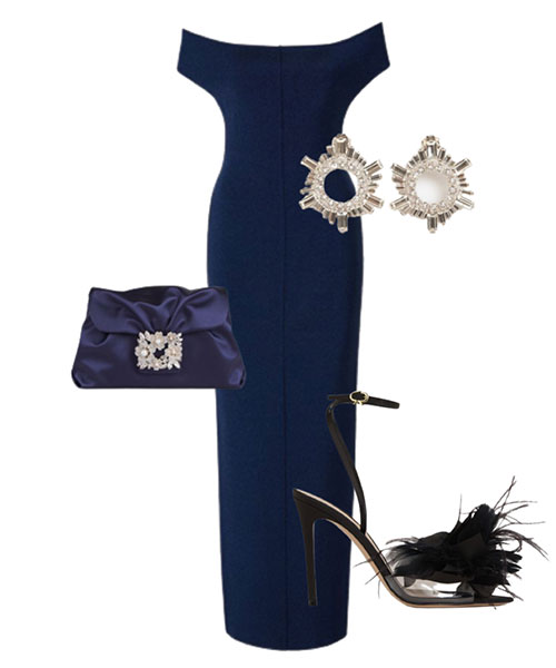 Cuando el evento requiere de una etiqueta formal es imprescindible apostar por un tono oscuro, descartando el negro si se trata de una boda. Para este look te proponemos un vestido ajustado con cuello barco de Alaïa que puedes sofisticar añadiendo unas sandalias de Gianvito Rossi con plumas e incorporar la tendencia del efecto joya con clutch de Roger Vivier que cuenta con cierre de pedrería.