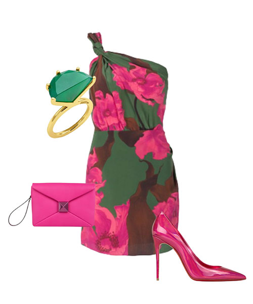 De los conjuntos más sofisticados nos trasladamos a las propuestas perfectas para arriesgar y añadir todo tipo de color y siluetas. Empezamos con un look de día formado por mini vestido floral de Johanna Ortiz. La mezcla de colores complementarios, aquellos situados en los polos opuestos del círculo cromático, nos invita a añadir un punto extra de contraste. En este caso elegimos el rosa para el bolso de mano de Valentino y los stilettos de Christian Louboutin y un sutil detalle en verde con el anillo de Suot Studio.