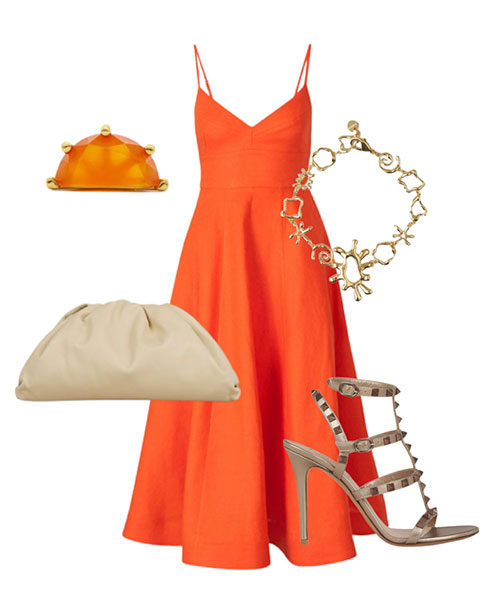 Empezamos con una colorida propuesta que juega con un romántico vestido de Zimmermann en naranja. Siguiendo la fórmula de los colores análogos, te proponemos complementos en tonalidades que se encuentren a los costados del de la pieza principal, como unos zapatos de Valentino y clutch de Bottega Veneta en nude y accesorios dorados y con detalles naranjas de Suot Studio para los pendientes y Jacquemus para el brazalete.