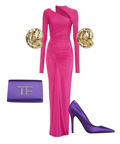 Si queremos seguir arriesgando para la noche, te presentamos un llamativo look protagonizado por un vestido rosa de Victoria Beckham con corte fruncido y escote asimétrico y cut outs. Para no restar protagonismo al color de la pieza principal, apostamos por un conjunto de bolso de mano y stilettos firmado por Tom Ford en un tono complementario al magenta y pendientes en dorado de Paola Sighinolfi.