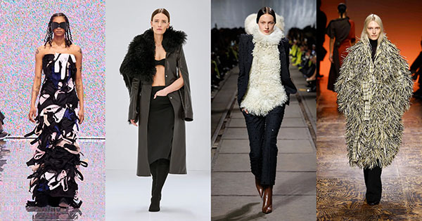 El punto de contraste más destacado entre las propuestas de la próxima temporada lo encontramos en los tejidos texturizados mediante el uso de lanas esponjosas, cuero con brillantes y pelaje o fibras entrelazadas. Balenciaga presenta un vestido con retales de cintas entrelazados, una propuesta más extrema que las que lanzan Courrèges y Alexander McQueen con sus abrigos de pelo. Por su parte, Bottega Veneta vuelve a experimentar con los flecos y las fibras mediante un abrigo que combina diferentes tonalidades blancas, negras y amarillas.