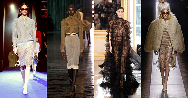 Durante las últimas colecciones, muchas de las firmas han apostado por el uso de pantalones shorts extremadamente cortos, una moda que ha desembocado en el uso de transparencias mezcladas con panties para conseguir estilismos sofisticados. Casablanca y Saint Laurent apuestan por las dos piezas con prendas de punto y blusas con faldas transparentes mientras que Tom Ford y Valentino se decantan por vestidos con volúmenes y efecto rejilla para las ocasiones más formales.