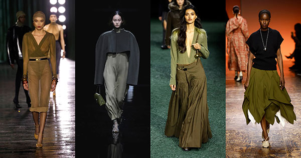 Si tuviéramos que elegir uno de los colores más repetidos en las cuatro semanas de la moda, el color caqui se llevaría la primera posición. Una amplia variedad de firmas ha apostado por diferentes tonos de este verde particular para estilismos de diario y de noche mediante prendas que rompen con los colores sobrios propios del invierno, como los diseños de Saint Laurent o Burberry, o a través de total looks con piezas del mismo tono. En este caso destaca el vestido recto de Khaite combinado con chaqueta o la falda asimétrica que firma Bottega Veneta.