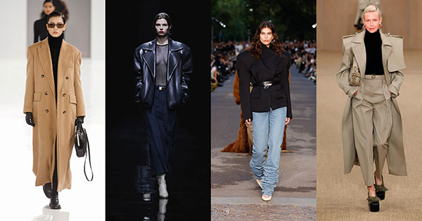 Los años ochenta volverán a estar presentes mediante el uso de hombreras pronunciadas que alteran la silueta del conjunto. Esta temporada las firmas se decantan por piezas cuyo patronaje enfatiza la forma del hombro en una amplia variedad de modelos, desde abrigos de doble botonadura en Max Mara o gabardinas en Balmain hasta blazers cruzados en The Attico o una chaqueta de cuero con cuello extra grande que firma Khaite.
