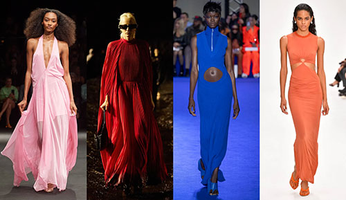 Analizando las colecciones SS23 vemos una clara apuesta por los vestidos largos, además de identificar una lucha de siluetas. Concretamente hablamos de la contraposición de los vestidos con tejidos fluidos y vaporosos, como los de las colecciones de Rotate y Balenciaga, con los diseños ajustados de punto y coloridos propio de los 90 que presentan Off White y Nensi Dojaka.