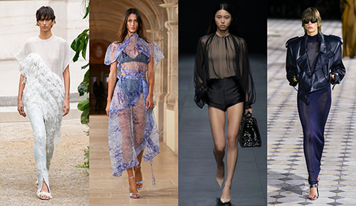 Según la plataforma de análisis de tendencias, que sintetiza las propuestas de las pasarelas en las cuatro capitales de la moda (Nueva York, Londres, Milán y París), las transparencias fueron un común denominador. En las colecciones de Zimmermann y Saint Laurent aparecieron vestidos ajustados con tejidos que dejaban al descubierto el cuerpo de las modelos, una fórmula que también siguió Victoria Beckham con un vestido estampado de tul y Valentino con un conjunto de dos piezas con camisa semitransparente.