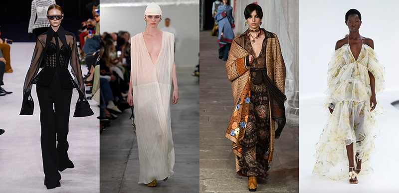 Llevamos varias temporadas viendo cómo la moda incorpora todo tipo de recursos para mostrar el cuerpo a través de las prendas. Tras varias temporadas jugando con los cut outs y las asimetrías, este invierno y el próximo verano será el momento de las transparencias. Algunas firmas como Balmain se decantan por looks formales de dos piezas, como este conjunto protagonizado por una camisa de tul negro. No obstante, la mayoría de firmas presentan una amplia variedad de vestidos con efecto rejilla o tejidos semitransparentes de diferentes estilos, desde los más minimalistas en Jil Sander hasta las opciones florales de Zimmermann y los estampados más eclécticos de Etro.